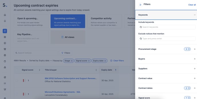 - Starting at the notices page, filter your view to the parameters and timeframe that you'd like to analyse (e.g. upcoming expiring contracts over the next 3 years in Healthcare).